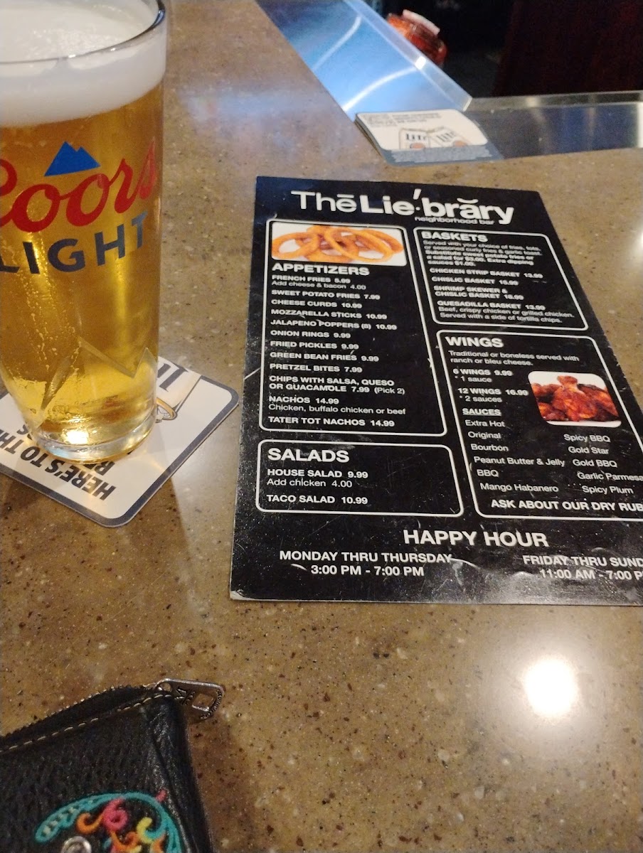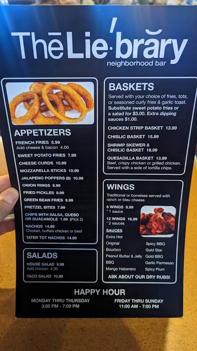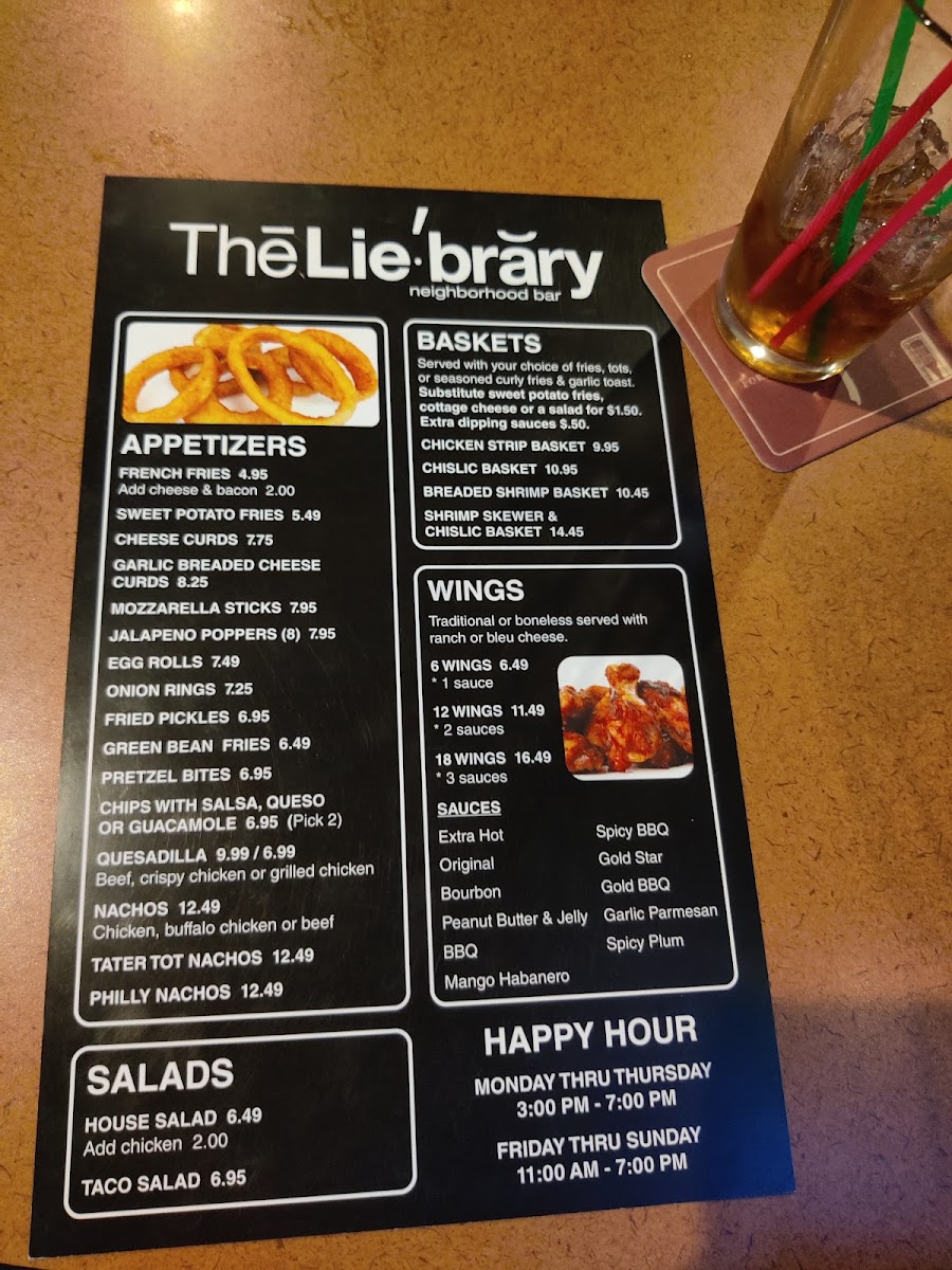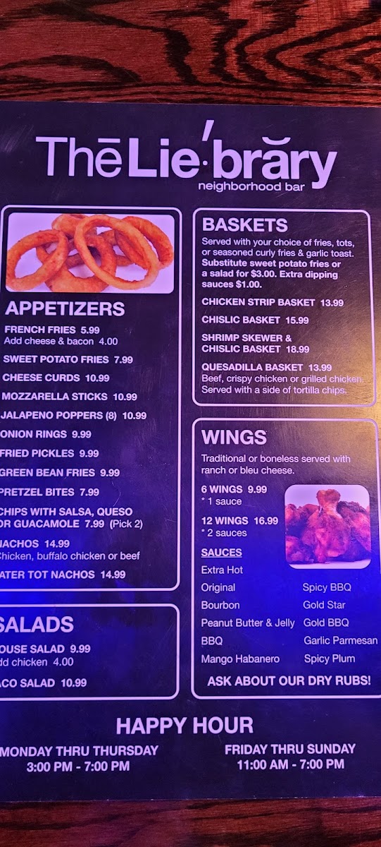 The Lie'brary offers a menu that balances casual bar favorites with satisfying grill options, perfect for relaxed gatherings and game-day hangouts. You’ll find a variety of shareable baskets like chicken strips, quesadillas, and their signature chislic, alongside classic burgers and wraps that pair well with a cold drink.