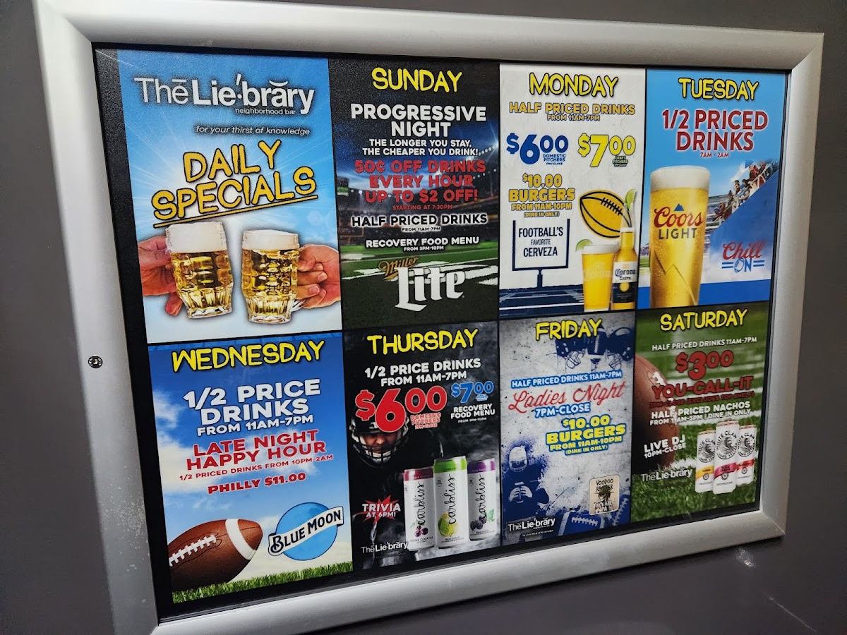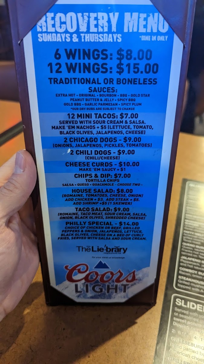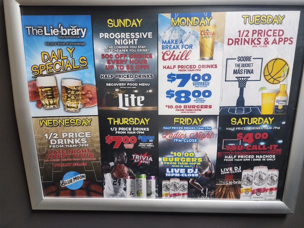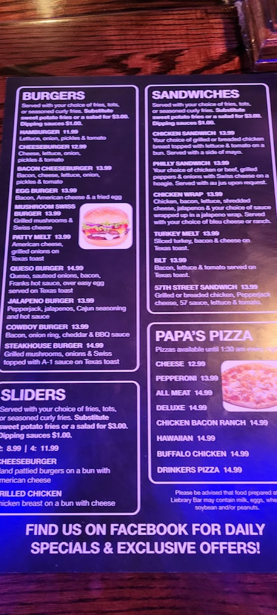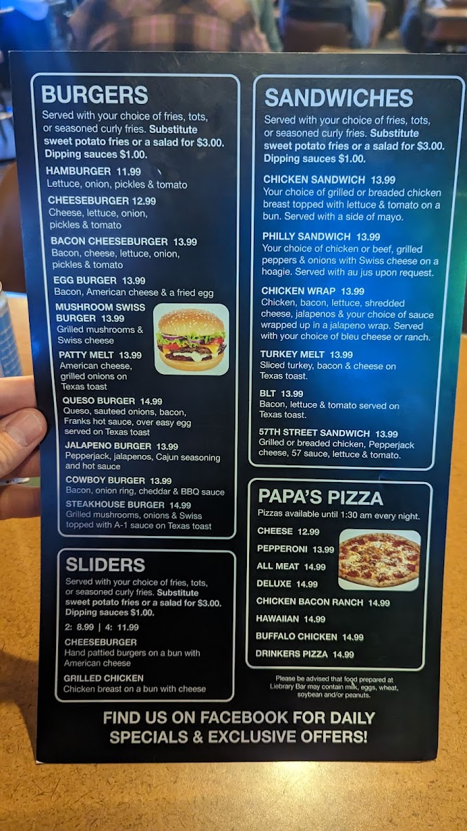 The Lie'brary offers a menu that balances casual bar favorites with satisfying grill options, perfect for relaxed gatherings and game-day hangouts. You’ll find a variety of shareable baskets like chicken strips, quesadillas, and their signature chislic, alongside classic burgers and wraps that pair well with a cold drink.